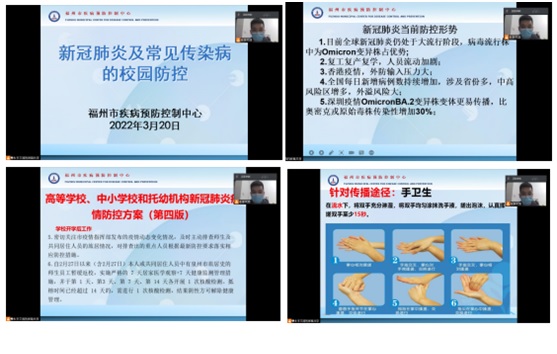 此次班会,李老师向同学们介绍了福建及学校当前疫情防控的形势,学校疫情防控部署要求及学院工作措施,特别强调学校和学院领导始终把师生的生命安全和身体健康放在第一位,严格管控校园、及时组织核酸检测。并且从新增病例产生的原因、如何做好疫情防控常态化、怎样保持良好心态三个方面如手进行讲解,其中重点强调个人防护的重要性,保持良好的卫生习惯,科学佩戴口罩,勤洗手、常通风、保持安全社交距离,不聚会。最后强调在此期间要注意情绪、心理状态波动,积极进行调整,注意个人身体锻炼,不忘提升自身抵抗力,疫情防控不容松懈。