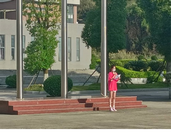 晨光熹微,清风徐徐。伴随着指挥员清脆洪亮的口令,国旗护卫队护旗昂首阔步,手护卫着国旗,迈着铿锵有力的步伐走向升旗台。在雄壮激昂、催人奋进的《义勇军进行曲》中,擎旗手挥臂扬旗,鲜艳的五星红旗冉冉升起、迎风飘扬;全体学生庄严肃立,向国旗行注目礼。