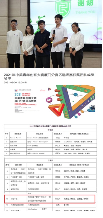 今日,由福建省教育厅主办,厦门大学承办的2021年中美青年创客大赛厦门分赛区选拔赛在厦门大学落下帷幕。经过48小时的“创客马拉松”现场比赛和评委们的作品评审及现场核查,beat365官方网站“好好干饭”团队的项目《校园食堂“智安”保卫兵——打造校园数字食安检管系统》(成员:张尧天、饶思莹、陈漪涵、黄文标、许明烽,指导老师:李文清)荣获三等奖。