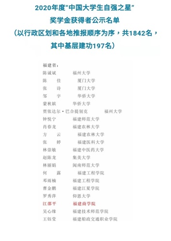 近日,由共青团中央、全国学联指导,中国青年报社、新东方教育科技集团联合开展的“青春自强奋勇争先”2020年度“中国大学生自强之星”奖学金评选结果揭晓,beat3652019级数据科学与大数据技术专业江邵平同学获2020年度“中国大学生自强之星”奖学金。